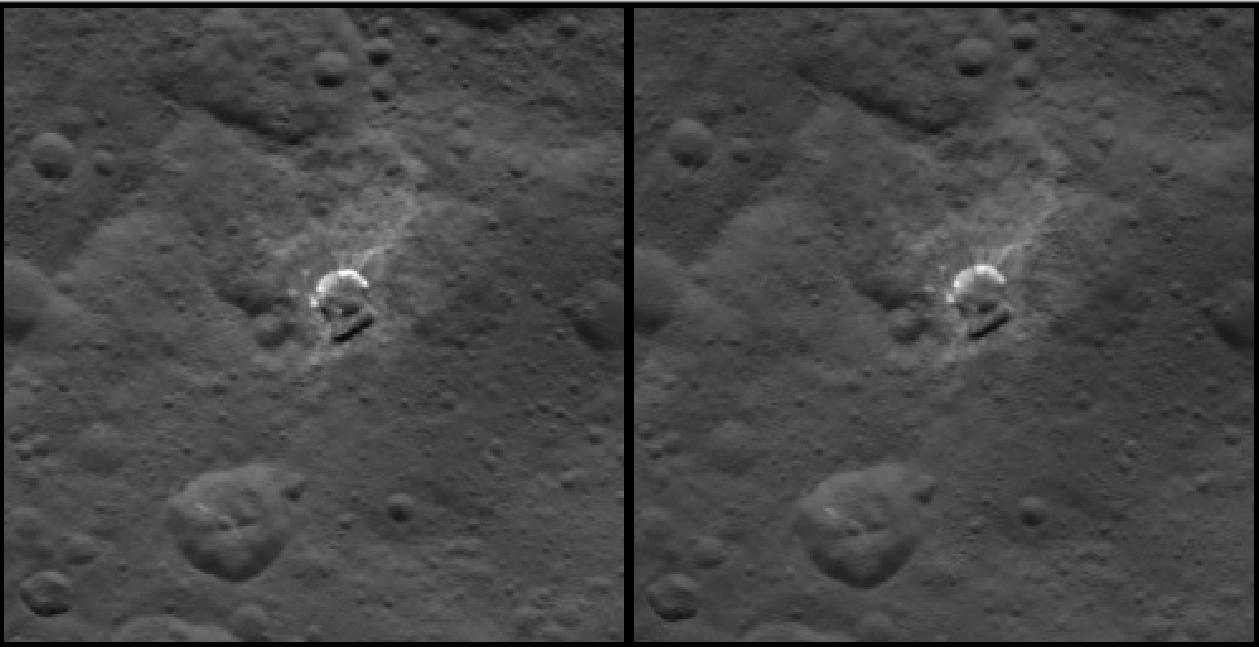 Notice that just outside the crater Occator, there's a big black spot of the same size of the white spots together.